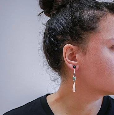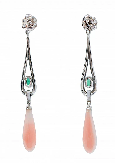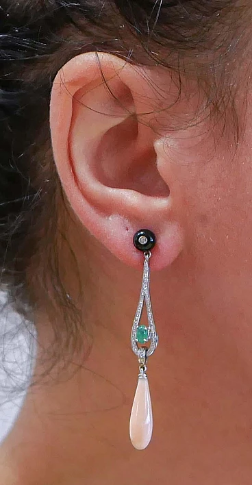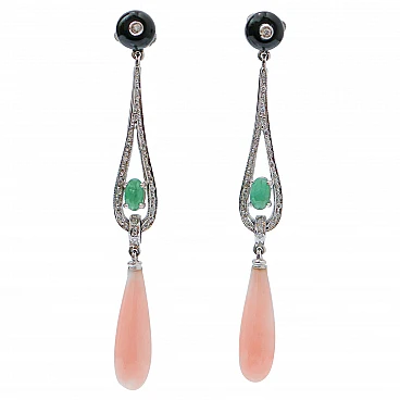 Pendant earrings in platinum, coral, emeralds, onyx, diamonds