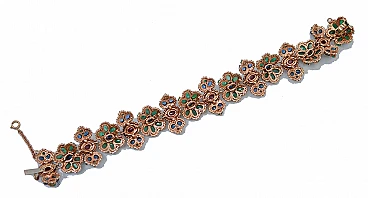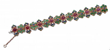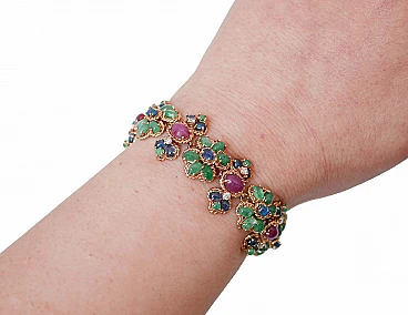 SHIPPING POLICY: No additional costs will be added to this order. Shipping costs will be totally covered by the seller (customs duties included). PS: THIS POLICY IS NOT APPLICABLE TO ITEMS WITH FIX PRICE, ITEMS AT AUCTIONS ,ONGOING PROMOTIONS AND ITEMS ON SALES. Amazing retrò bracelet in 14 kt rose gold structure mounted ith flowers of emeralds and a central sapphire. Between of them, structure with a ruby and, externally, diamond, sapphires and emerald. This bracelet was totally handmade by Italian master goldsmiths and it is in perfect conditions. Diamonds 0.97 ct Emeralds, Rubies and Sapphires 36.76 ct Total Weight 34.50 gr RF +CEAA For any informations, feel free to contact the seller through the message center.