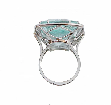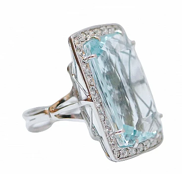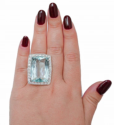 No additional charges will be added to this order. Shipping costs are fully borne by the seller (including customs duties). This policy does not apply to fixed price items, auction items, ongoing promotions and sale items; please write to the seller for more information. Incredible 14 kt white gold frame ring mounted with a central aquamarine surrounded by diamonds. This ring was made entirely by hand by Italian master goldsmiths and is in perfect condition. Diamonds 0.90 ct. Aquamarine 40 ct - 26 mm x 19 mm. Total weight 15.60 gr RF +GIHHR K.K. Italian size 16.5, US size 7.75, French size 56.5. For any information, feel free to contact the seller through the message centre.