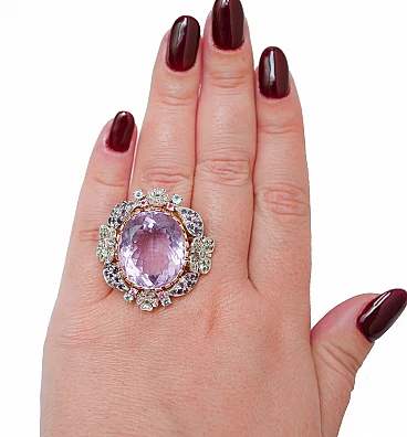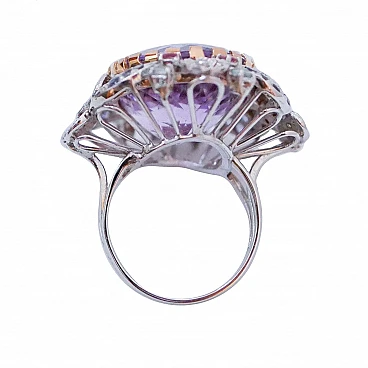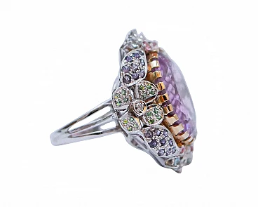 No additional costs will be added to this order. Shipping costs are fully borne by the seller (including customs duties). This policy does not apply to fixed price items, auction items, ongoing promotions and sale items; please write to the seller for more information. Fantastic 14 kt white gold ring mounted with a central amethyst surrounded by a frame of leaves and flowers studded with diamonds, topazes, iolite, peridot and tourmaline. This ring was made entirely by hand by Italian master goldsmiths and is in perfect condition. Diamonds 0.16 ct. Peridots, tourmaline, iolite and topaz 1.69 ct. Amethyst 26.97 ct. Total weight 17 gr RF +FACA. Italian size 19, US size 8.75, French size 59. For any information, feel free to contact the seller through the message centre.
