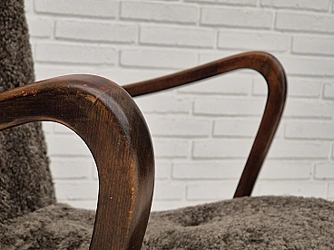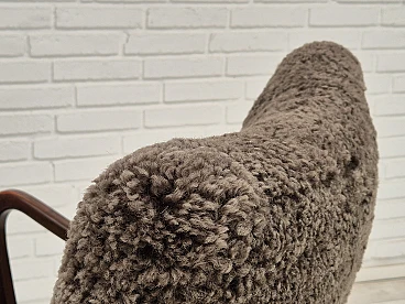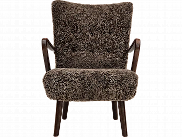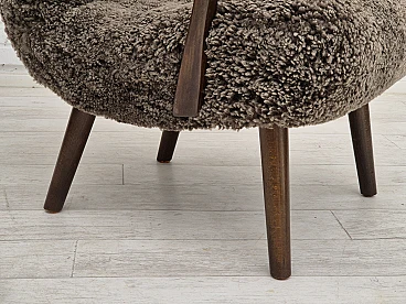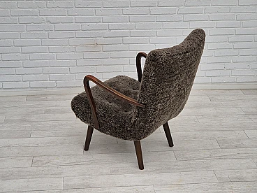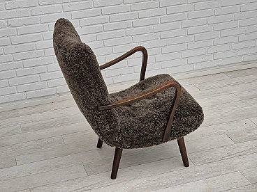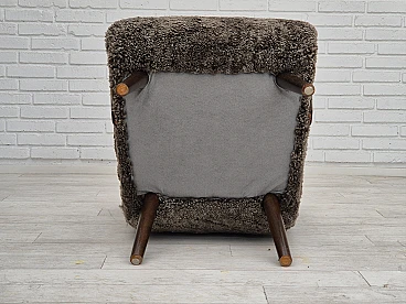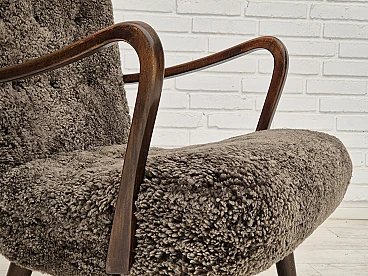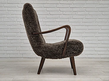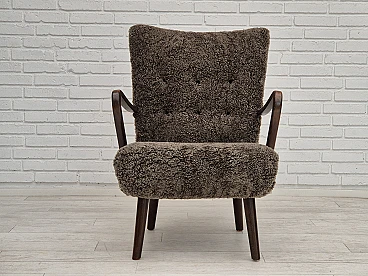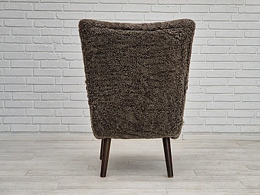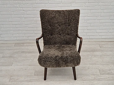 Refurbished and upholstered Danish armchair, 1960s. Upholstered in genuine New Zealand quality ‘Wellington’ sheepskin. Renovated beech wood armrests and legs. Partially new upholstery. Original seat springs are retained. Produced by a Danish furniture manufacturer around the 1960s. Reupholstered by a professional upholsterer, craftsman.