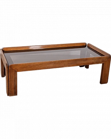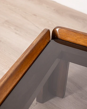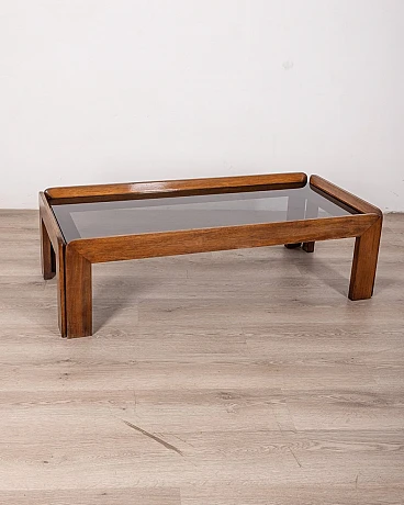 Coffee table in polished walnut wood and smoked glass top, design Afra & Tobia Scarpa, 1970s.