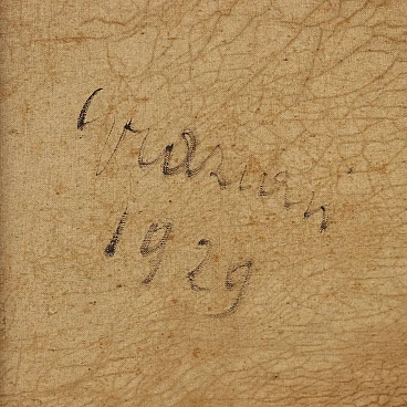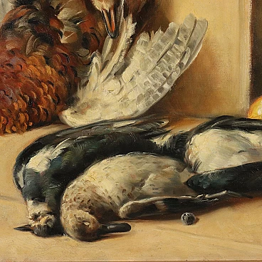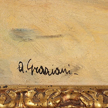 Oil painting on canvas. Signed lower left. further signature and date on the back. Alfio Paolo Graziani chose the faithful transposition of reality onto his canvases, creating almost hyper-realistic compositions due to the precision in reproducing the various materials and surfaces, as well as the effects of the light incident on them. Nicknamed "Prince of Flowers" for his abundant production of floral compositions, he also created landscapes, portraits and still lifes. In his still lifes, as is clearly evident in this work, the presence of grapes is recurring, which allows the play of light on the individual grapes, as well as the presence of elements relating to hunting, both prey and tools. The work is presented in a frame.