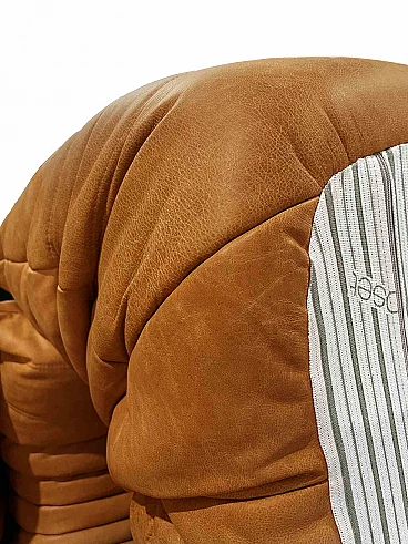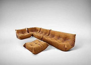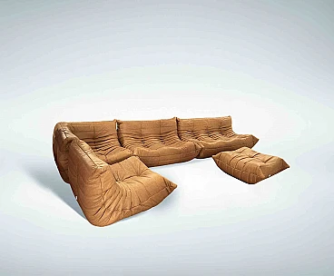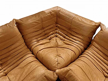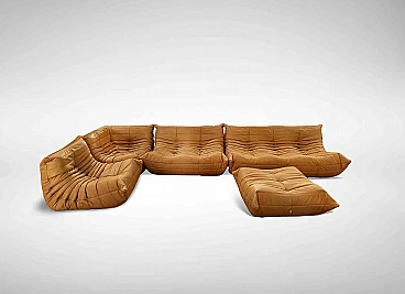 Togo sofa is a 1990s design sofa set designed by Michel Ducaroy for Ligne Roset.A Ligne Roset classic, Michel Ducaroy's Togo has been the ultimate in comfort and style for over forty years.The set consist in four cognac leather all-foam cushion seating and an ottoman.Excellent condition.Dimensions:- Ottoman 31.5 x 27.56 x 11.02 in. / 80 x 70 x 28 cm- Armchair 31.49 x 35.43 x 25.98 in. / 80 x 90 x 66 cm- 2 seaters Sofa 47.24 x 35.43 x 25.98 in. / 120 x 90 x 66 cm- Corner sofa 35.43 x 35.43 x 25.98 in. / 90 x 90 x 66 cm- 3 seaters sofa 66,9 x 35,43 x 25,98 in./ 170 x 90 x 66 cm Excellent condition.