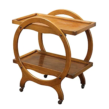 Double-tier bar cart in stained beech wood and walnut veneer shelves. Italian production, 1950s.