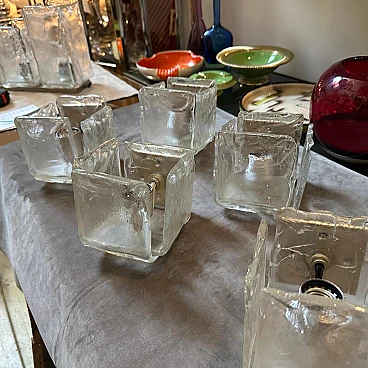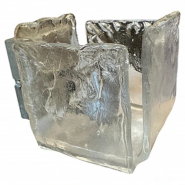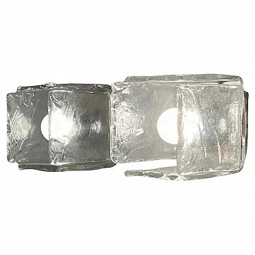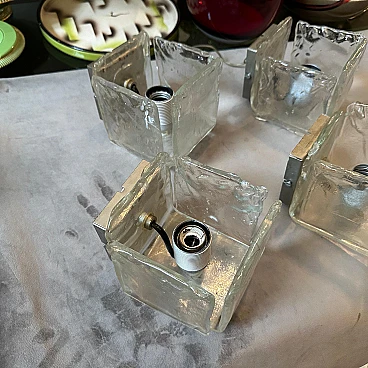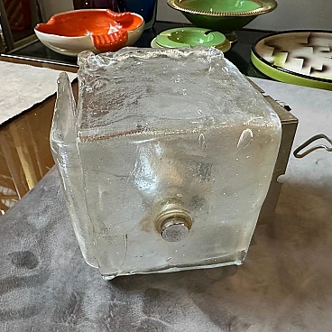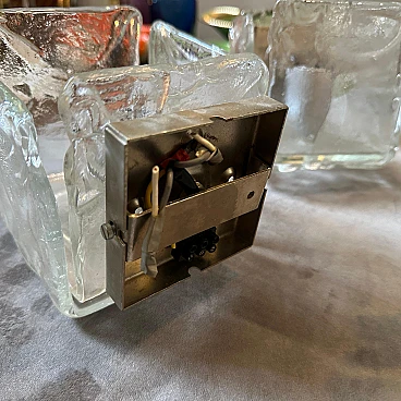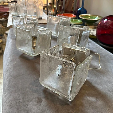 Toso's 1970s modernist Murano glass square wall sconces are distinctive and artistic pieces that reflect the innovative glasswork for which Murano is renowned. They can also be used as ceiling or table lamps. Overall, they are in good condition and in working order. The sconces have a square shape and consist of four thick glass panels arranged to form a box-like structure. Each panel has an irregular, ice-like structure that gives the impression of frozen, translucent blocks of ice. This design creates an extraordinary visual effect, especially when the sconce is illuminated. The glass panels have a frosted, almost matt finish with rough, textured surfaces reminiscent of natural ice formations. This texture adds depth and tactile quality to the wall lights. The brackets are discreet and do not alter the overall aesthetics of the glass. When illuminated, the wall lights project a diffused light that emphasises the unique texture of the glass. These wall sconces by Toso are exquisite examples of the art of Murano glass and combine functional lighting with a sculptural and decorative quality. Their ice-like appearance and modernist design make them timeless pieces that can enhance various interior styles.