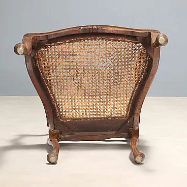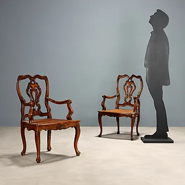 Pair of different walnut armchairs in Barocchetto style, Italy early 20th century. Open backs with carved folders, wavy arms and legs. Frame embellished with carvings depicting curls, phytomorphic elements and rocaille taste. Tunneled seats.