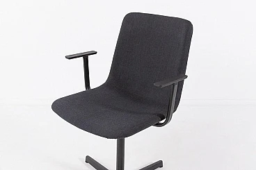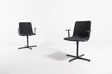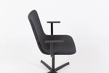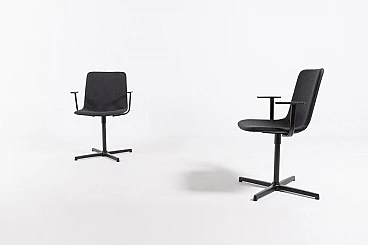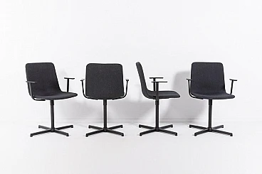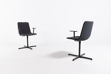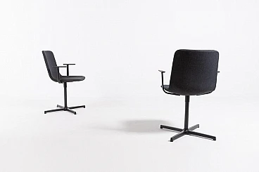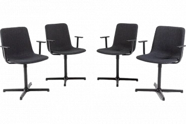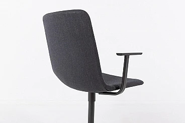 The Pato Collection is the ideal choice for spaces designed for lounging, dining, working and living. Pato shell has always been made from recyclable PP, which is pure and free from any additives. By adding upcycled plastic waste while keeping the design recyclable in the future, the producer follows the strategy to minimise our environmental footprint and contribute to the circular economy. The chair frame in steel is made from quality steel and the surface is treated with eco-friendly, solvent-free powder coating and the textiles offered by Fredericia for Pato all carry the EU Ecolabel. These chairs have a rotatable steel leg with a gray fabric seat upholstery. Priced per set of 4. Condition: Minimal signs of use, few marks on the armrests.