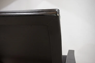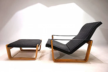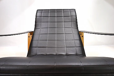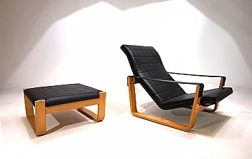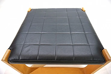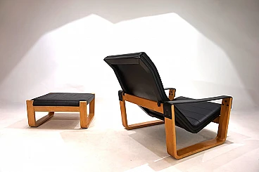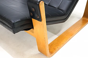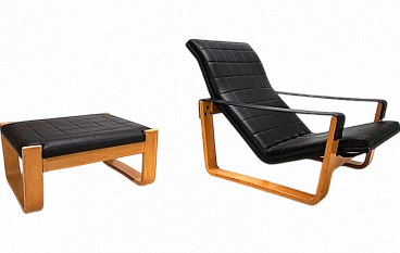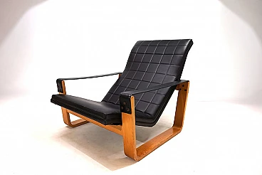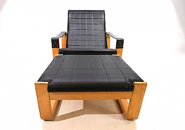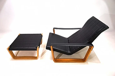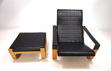 The Asko Pulkka armchair in black vegan leather is, like the ottoman, in excellent condition. The upholstery has the typical Pulkka check quilting, is in very good condition and has only minor wear on two corners. The armchair shell is set in a honey-coloured wooden frame and is adjustable in various ways. The frame shows signs of wear appropriate for its age. In combination with the ottoman, which is also in excellent condition, the Pulkka armchair offers a fantastic seating experience. Finnish designer Ilmari Lappalainen designed this armchair for Asko Finland in the late 1960s, creating a design classic. The Finnish furniture manufacturer Asko was founded in 1919 and made a name for itself in the 1960s and 1970s by collaborating with top designers and offering innovative design.