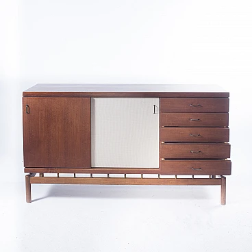 Rare Sideboard by Ilmari Tapiovaara. Manufactured in Italy by La Permanente Mobili Cantù, end 1950's. Item made in Teak Wood, details in brass and fabric. This piece is part of a set designed by Ilmari Tapiovaara in occasion of Selettiva Exhibition in Cantù in 1957. The set won the first prize ex aequo in the ‘Living room’ category.