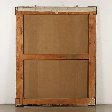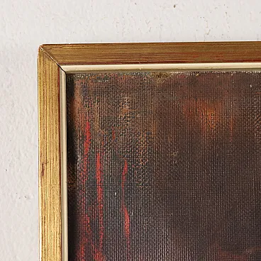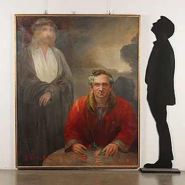 Oil on canvas. Signed lower left. The large painting features two figures: on the right a man sitting at a table, dressed in a red dressing gown, with a sad and concentrated expression, playing with his hands with some disheveled flowers, coming from the composition on his head; on the left standing the Christ of the Passion, crowned with thorns, with a gray cloak on his shoulders. Behind the seated man, a leaden sky in which, however, a ray of light opens. The painting probably wants to allegorically depict the painful and suffered end of the life of a person, who lives the same Passion as Christ, but who yearns for a new, bright life. The work is presented in a frame.