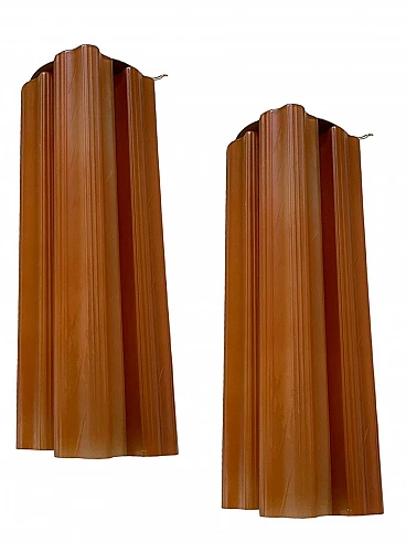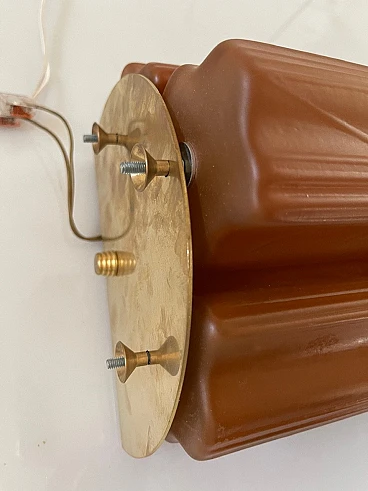 Pair of Tronchi Tube glass wall sconces, 1970s. Price - €950.00 per set. Modern Italian style. Pair of polished Tronchi glass tubes, burnt orange colour, brass frame. Height 47 cm, width 19 cm, depth 12 cm. Features two lights, requires E14 bulbs. New wiring installed compatible with Europe, UK and USA. Weight under 40 kg. Very good condition, this vintage/antique item has no defects, but may show slight traces of use. Partially restored, rewired and/or new electrical components. Is this piece in working order? Yes, I had a professional electrician rewire the piece.