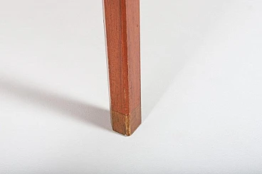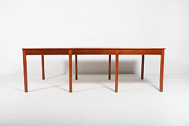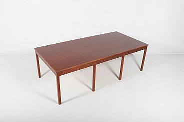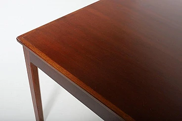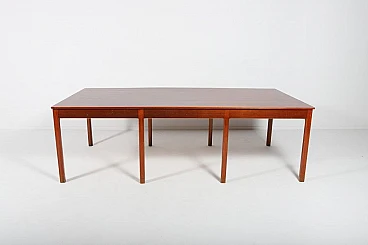 A spectacular mahogany and teak table by Ejner Larsen & Aksel Bender Madsen for Willy Beck / Morten Olsen. The defining feature of this series is the rounded inner edge of the leg/frame joint. Additionally, the inner corner of the legs is chamfered, giving the legs a lighter appearance. Also note the contrasting teak feet on each leg, which add visual interest to the piece. The legs and frame are solid mahogany, while the edge of the table top is rounded in teak. Good condition, wear and tear consistent with age.