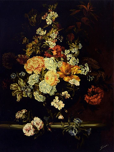 Enrich your art collection with this exquisite floral oil painting by the talented self-taught artist Roberto Suraci. Measuring 60x80 cm, this eye-catching piece shows Suraci's unique vision of nature through vibrant colours and intricate flower shapes. The painting is set in a magnificent frame, which brings the total dimensions to 102x82 cm. Roberto Suraci's artistic career began with the exploration of various materials for sculpture such as tuff, ceramics and wood, before focusing his attention on classical painting. His passion for contemporary art subtly influences his work, resulting in works that are both timeless and modern. Suraci's mastery of capturing the essence of nature is evident in this floral composition, where each brushstroke conveys warmth and vibrancy. This painting is a perfect addition for art enthusiasts and collectors who appreciate the beauty of nature and the skilful craftsmanship behind it. Its presence will add a touch of elegance and sophistication to any space, making it a focal point of the home or office. Do not miss the opportunity to own this extraordinary painting by Roberto Suraci.