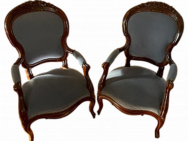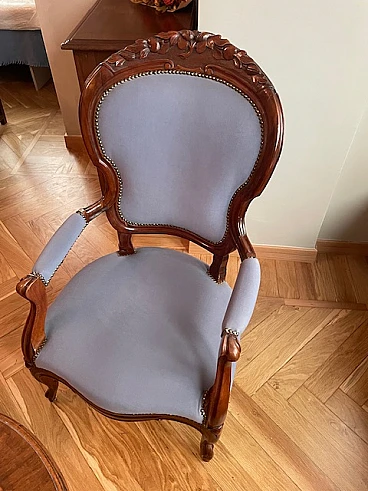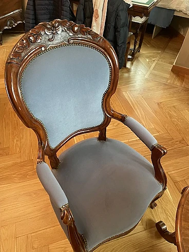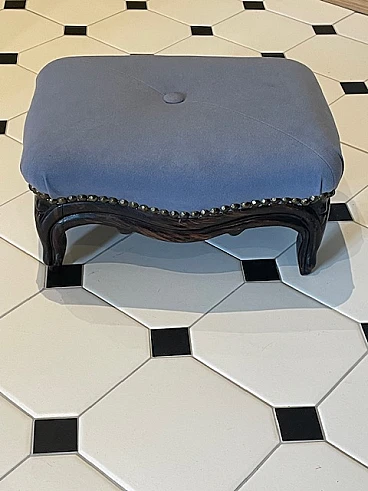 Pair of armchairs with a wavy line, carved wooden part, upholstered back and seat. A pouf restored using the same velvet and upholstery completes the graceful parlour. Dark walnut wood, probably originating in the Orient but very common in Europe, is a hard wood with a beautiful grain, much used in antique furniture. It was a wood that was widely used in Italy throughout the Renaissance and was later widespread in Europe, especially in England, until the advent of mahogany. It was used for solid wood furniture and sometimes carvings and inlays. In France, it was more widely used in the provinces. In the second half of the 18th century its use declined considerably because mahogany and other exotic woods were preferred.