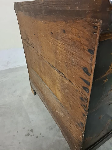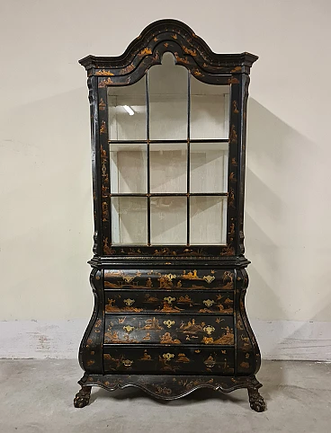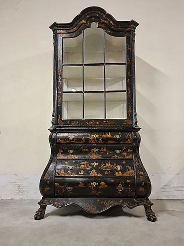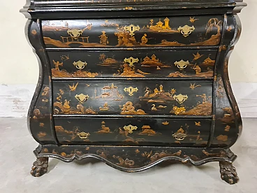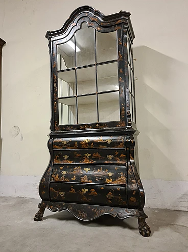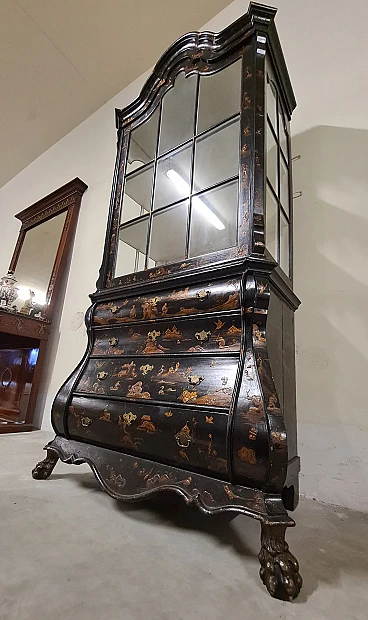 Dutch chinoiserie-lacquered double-bodied trumeau. Large double-bodied trumeau in the typical form of Dutch manufacture. Lower part divided into 4 wavy drawers, lion feet and bronze fittings. Single-door glass riser surmounted by a shaped and inlaid hat. The cabinet is entirely decorated in ebonised Chinese lacquer with hand-painted golden decorations in relief typical of oriental art. The production of this elegant piece of furniture can be dated to the first half of the 19th century. Elegant and highly decorative, this piece of furniture is ideal for giving a touch of the Orient to one's surroundings.
