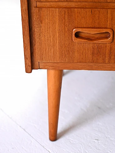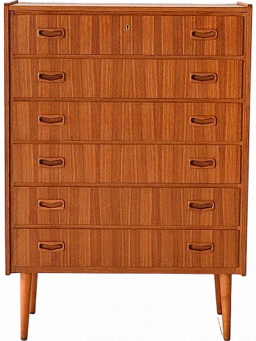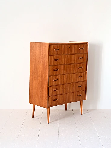 This vintage six-drawer chest of drawers is a unique and charming piece of furniture, original from the 1960s. With its elegant design and finely crafted details, it integrates perfectly into different environments of the house. The first drawer, equipped with a lock, offers a safe space for valuable objects. The handles are carved in wood and resemble the shape of a heart. The marked veins are a distinctive element that gives character and authenticity to the chest, highlighting its origin and the quality of the materials. The tapered conical legs, typical of vintage design, give a timeless elegance and stability to the structure. A versatile piece of furniture that can be placed in different environments of the house: in the bedroom as a wardrobe for linen, at the entrance to store accessories, or in the living room as a decorative and functional element. Every detail, from carved handles to wood veins, tells a story and transforms this chest of drawers into a piece of furniture that combines aesthetics and practicality. Good condition. A conservative restoration has been made using natural materials. It may present signs of age. Please pay attention to the photographs.