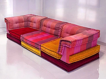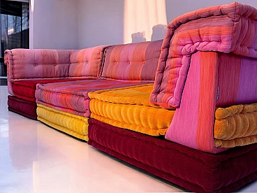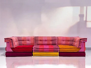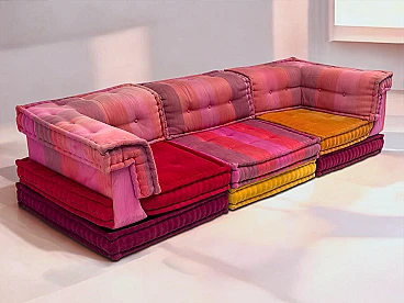 Indulge in the emblem of luxury with the original Mah Jong sofa, decorated with high-quality fabrics designed by Kenzo Takada exclusively for Roche Bobois. This set has is in good vintage condition with slight signs of wear, all fabrics are free from rips and/or heavy stains and all the buttons of the cushions are present and intact. This competitive price is related to a set of nine pieces composed as follows: two corner backrests, one straight back, six square cushions. Cushion: width 95 cm (37.5"), depth 95 cm (37.5"), height 19 cm (7.5"). Armchair without armrests with two cushions: width 95 cm (37.5"), depth 95 cm (37.5"), height 72 cm (28.3"). Corner seat: width 95 cm (37.5"), depth 95 cm (37.5"), height 72 cm (28.3").