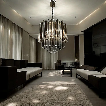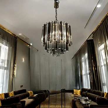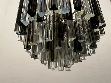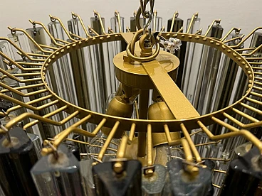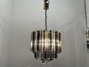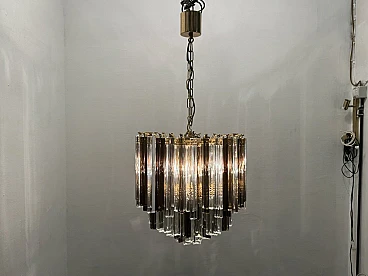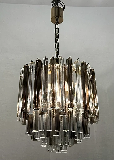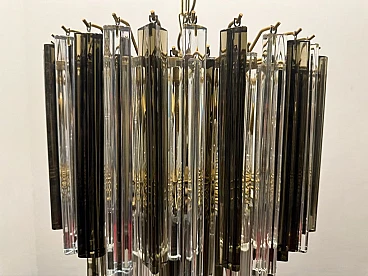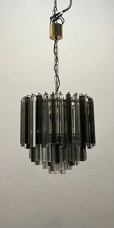 Smoked and transparent Murano glass Trilobi chandelier by Venini, 1970s. Price - € 1 750.00 per item. Modern Italian style. This piece was designed in the style of the designer and/or manufacturer mentioned. Brass frame. Width 50 cm, height without chain and ceiling canopy 50 cm, total height with chain and ceiling canopy 100 cm. Features four lights, requires E27 bulbs. LED and dimmable bulbs work well, if you have a dimmable circuit. Newly installed wiring compatible with EU, UK and USA. Weight between 40 kg and 80 kg. Good condition, this vintage/antique item may show some signs of wear such as scratches and other signs of ageing. Light wear consistent with age and use, electrical components rewired and/or new. Is this piece in working condition? Yes, I had the piece rewired by a professional electrician.
