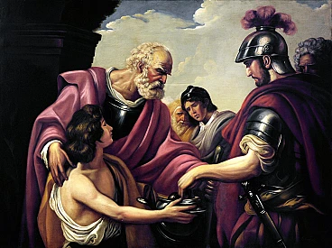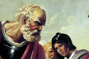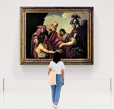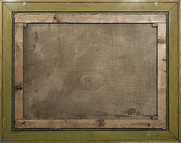 Ettore Frattini's technique is detailed, with touched brushstrokes and an excellent sense of realism. The color is treated with the enthusiasm of those who are in contact with the pictorial ways of the seventeenth century, which contrast with large chiaroscuro effects. In this work, the artist pays homage to the master of French neoclassicism François-André Vincent with masterful skill and dedication. The work portrays a scene starring Flavius Belisarius, a Byzantine general who served under Justinian I (527-565). Legend has it that the general was blinded and made a beggar and then recognized by one of his former soldiers. The dimensions of the framed work are 151 x 191 cm.