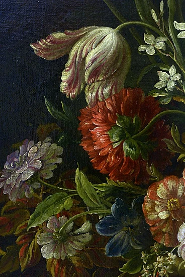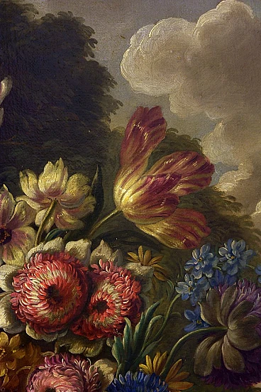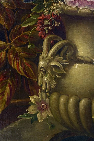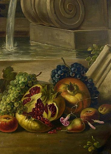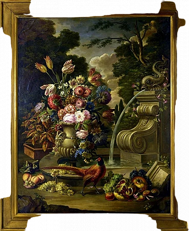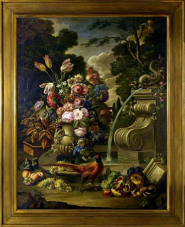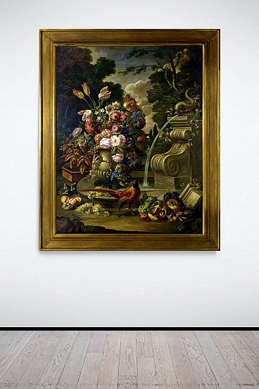 This vibrant painting by Alfredo Mahieux represents a masterfully executed still life scene with a palpable sense of life. The artwork features a colorful pheasant in the foreground, with a rich bouquet of bright flowers bursting from a classic vase, all accentuated by succulent fruits and an opulent composition that fills the scene. The generous size of the piece, complemented by an elaborate frame, makes it a significant focal point for any setting. Every detail is meticulously crafted, from the delicate brushstrokes on the flower petals to the realistic textures of the pheasant and fruit. This painting not only captures the essence of traditional still life but also adds a touch of timeless elegance. Ideal for collectors and art connoisseurs who appreciate early 20th-century works, this piece offers an immersion in classic beauty and exquisite craftsmanship. Dimensions of the painting: 130 cm x 100 cm Frame dimensions: 152 cm x 122 cm