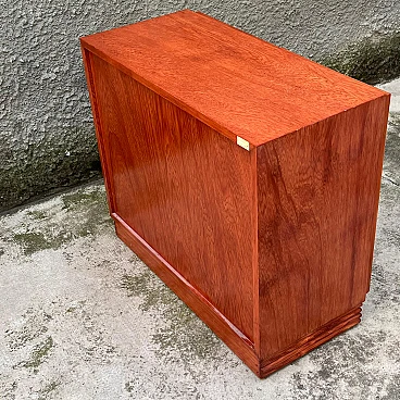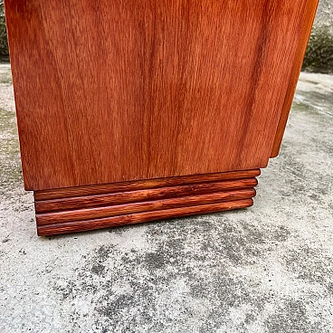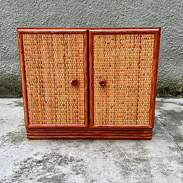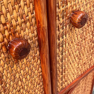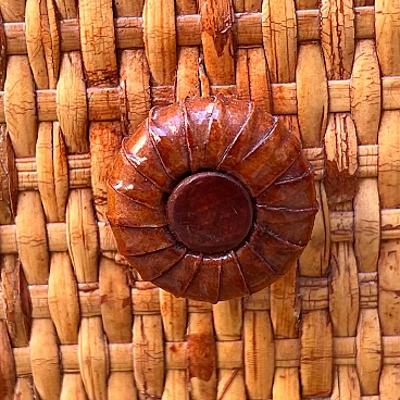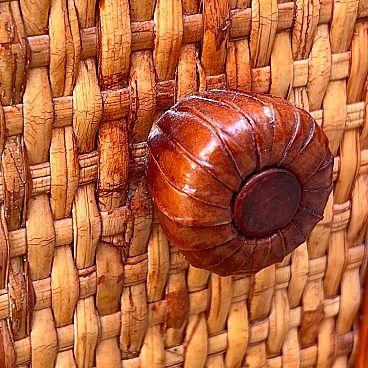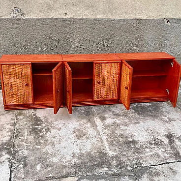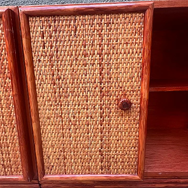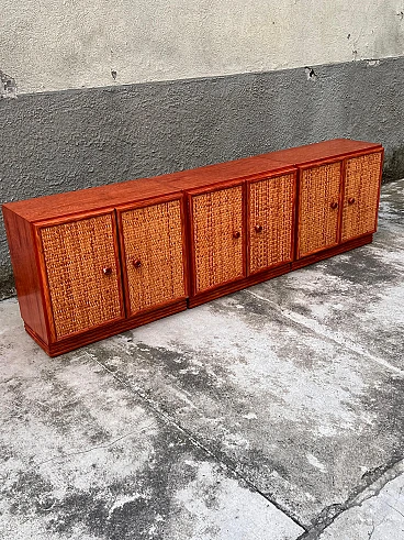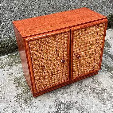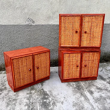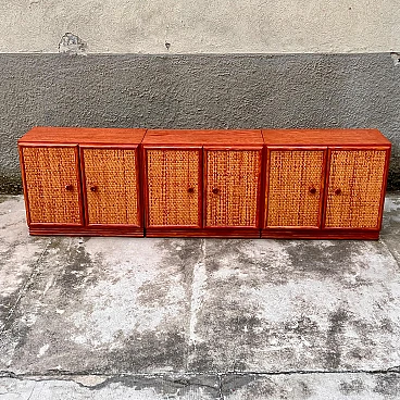 Elegant storage unit from the 1980s, the result of a collaboration between the renowned French companies Maugrion and Roche Bobois. This unique piece, made of fine mahogany wood, is distinguished by its woven wicker front doors that lend a touch of authenticity and naturalness. The leather-covered door knobs add a further element of refinement, making this piece of furniture not only functional but also a true design element. Three examples of this piece of furniture are available, which can be purchased individually or as a block, offering the possibility of composing a modular sideboard. Each piece retains its own unique identity while integrating harmoniously with the others. Maugrion: Known for its craftsmanship and use of fine materials, Maugrion has helped define the elegant and timeless style of French furniture, combining tradition and innovation. Roche Bobois: A world leader in high-end furniture, Roche Bobois is synonymous with excellence in contemporary design. The company collaborates with internationally renowned designers and craftsmen, offering exclusive collections that stand out for their originality and quality. This furniture is perfect for those looking for a piece of furniture that combines traditional craftsmanship with sophisticated design, suitable for any elegant and sophisticated environment.