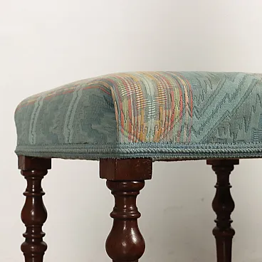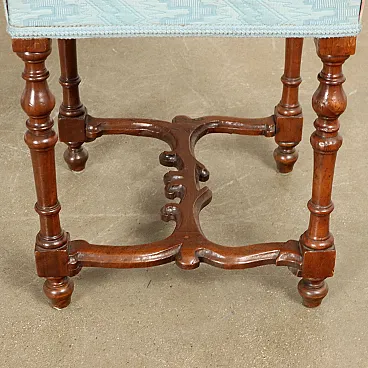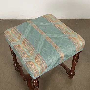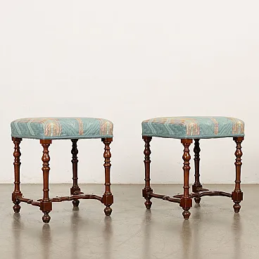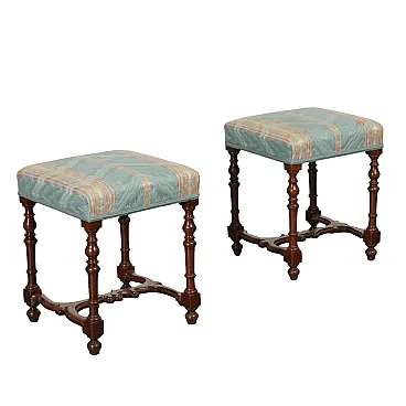 Pair of walnut stools, turned legs joined by carved cross with leaf motif, upholstered seat. Italy, late 19th century.