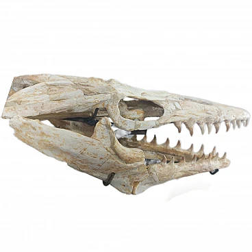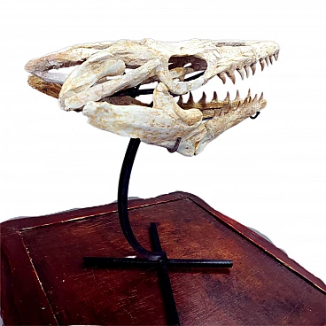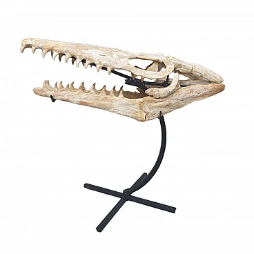 This skull belonged to a "Halisaurus Arambourgii" Mosasaur. This particular species didn’t grow very big. Full grown adults may have reached up to 12 ft in length. Like all other Mosasaurs, this animal was a swift, agile swimmer employing its four paddles and stout tail to propel itself. This specimen was found in the phosphate mines of “Sidi-daoui, Morocco” it dates back to the Maestrichtian period, about 70-65 million years ago. This skull has been professionally prepared and mounted on a custom iron sand. It features great detail and preservation with minimal restoration.
