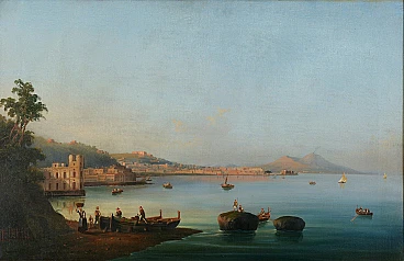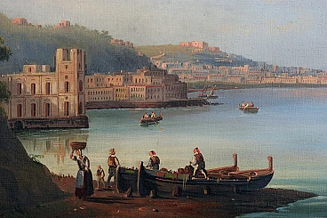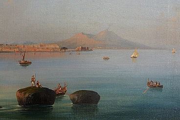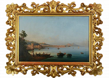 This exceptional pair of paintings from the Posillipo School showcases two captivating scenes: a panoramic View of Naples and the charming View of Nisida. These 19th-century artworks are a true representation of Neapolitan landscape painting at its finest. Offered as a pair, they are complemented by their original, hand-carved, gilded frames, which further elevate their artistic and historical value. The original frames are masterpieces in their own right, meticulously hand-carved by master craftsmen and adorned with genuine gold leaf, polished with agate stone to achieve a radiant finish. Despite a few minor signs of wear due to age, the frames remain in excellent condition, having never undergone restoration. The gold leaf retains its brilliance, showcasing the authenticity and charm of the 19th-century craftsmanship. The paintings themselves measure 75 x 49 cm, while the ornate frames bring the total dimensions to 107 x 84 cm. This pair of paintings, along with their spectacular frames, stands as a testament to the high-quality art of the 19th century and the superb craftsmanship of the period. The combination of the two creates a visually striking ensemble that appeals to discerning collectors of historic fine art. These pieces are perfectly suited for serious art collectors who value high-quality, authentic 19th-century artwork. The pairing of these scenic views with their magnificent, untouched frames makes this set a unique and valuable addition to any significant collection.