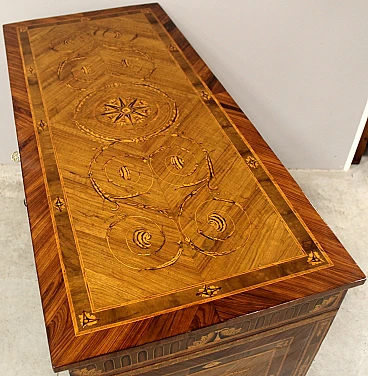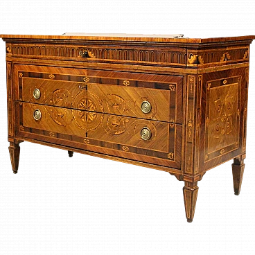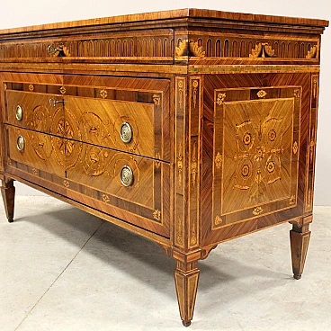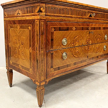 Neoclassical Louis XVI chest of drawers with three drawers (in Maggiolini style). Veneered in walnut and various precious woods, richly inlaid and threaded in various polychrome woods. Restored. Certificate of Authenticity.