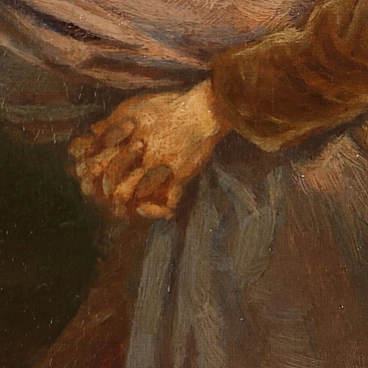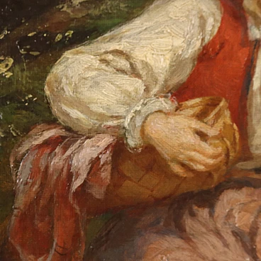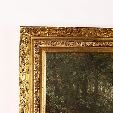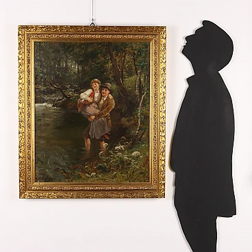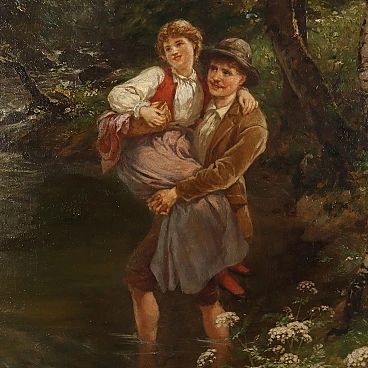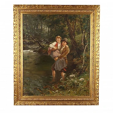 Oil on canvas. Signed and dated lower left. The German painter Oesterley devoted himself mainly to Nordic landscape painting, in his last period especially to Norwegian landscapes (with fjords and snow-capped mountains). In this work, however, he proposes almost a genre scene, albeit set in a distinctly Nordic landscape: within a dense woodland, perhaps a forest, a pair of young peasants are crossing a stream, with the boy chivalrously carrying the maiden in his arms. The two figures enliven the landscape with their colours and the joy they express. The painting is presented in a stylish frame.