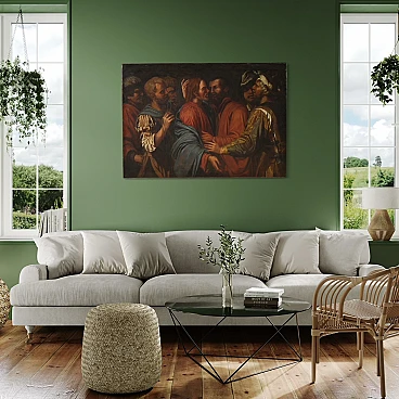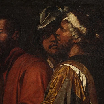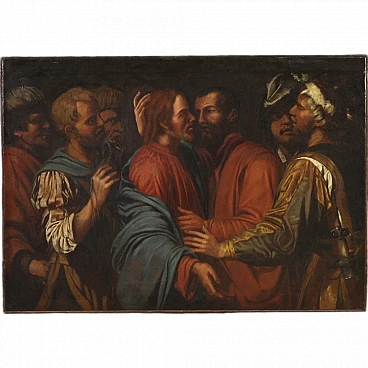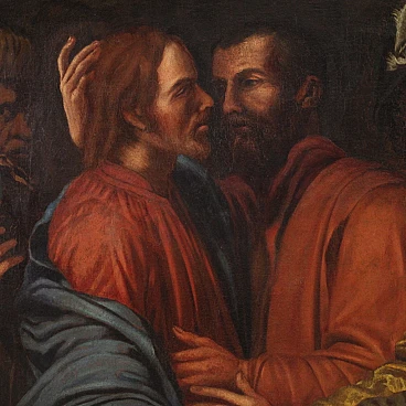 Italian painting from the second half of the 17th century. Oil work on canvas depicting the kiss and therefore the betrayal of Judas in the Garden of Gethsemane. This was in fact the signal agreed with the guards to recognize Jesus and arrest him. Painting of excellent pictorial quality which can be seen particularly in the drapery and details of the clothes. Note how Christ and his disciples wear old-fashioned clothes while the soldiers are depicted with typical seventeenth-century clothing. Painting already restored with relining, replacement of the frame and recovery of color in some places. Overall, it is in a good state of conservation. Light painting H 105 x W 150 cm.