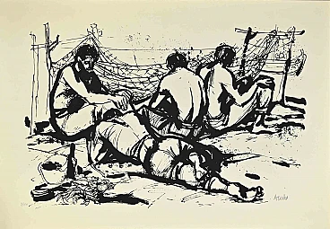 Fishermen is a print artwork on paper realized by Manfredo Acerbo in the 1970s.Screen print on paper.Hand-signed and numbered by pencil on the lower, edition of 100 prints.Very Good conditions.The artwork is realized through deft expressive strokes and mastery to make the feeling of the scene realistic.