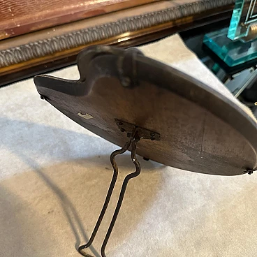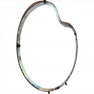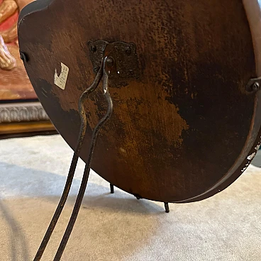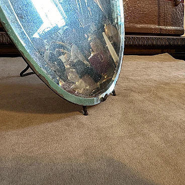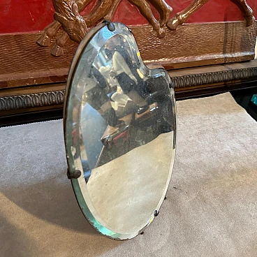 This mirror features a unique, palette-shaped design, resembling an artist's paint palette, which adds a distinctive and creative flair to its appearance. The mirror's frame is constructed from polished wood, which has aged gracefully, showing a warm patina that adds character and history to the piece. The wood frame is complemented by the elegant, curved lines typical of the Art Deco period, giving it a sleek and sophisticated look. The glass of the mirror is slightly beveled along the edges, creating a subtle yet sophisticated depth to the reflection. The glass shows some signs of aging, with a few spots and a slight cloudiness that add to the vintage charm of the piece. Around the perimeter of the mirror are small, metal studs that secure the glass to the frame. These metal accents enhance the mirror's decorative appeal and highlight the meticulous craftsmanship characteristic of L. Fontana's work. The back of the mirror is supported by a simple metal stand. The mirror is in original condition with signs of use and age.