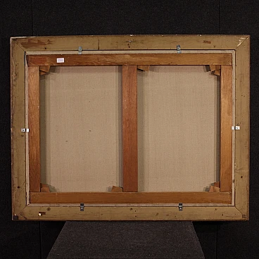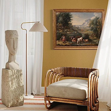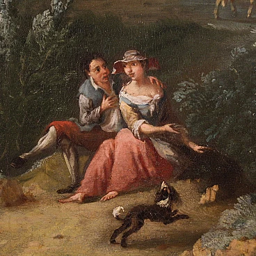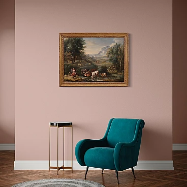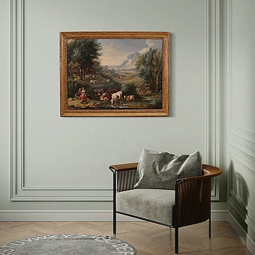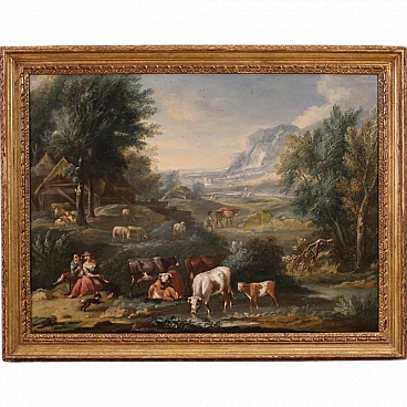 Venetian school of the second half of the 18th century. Oil painting on canvas depicting an Arcadian landscape of a pastoral genre. This type of pictorial representation established itself in the eighteenth century, alongside the view and the architectural whim, inspired by the rules of the Academy of Arcadia. The new rules of Arcadia impose clear and convenient manners, playful rhythm and elegant form. It is these regulations that have dominated Italian pictorial culture since the early eighteenth century, known as "arcadian rococo". The painting depicts in the foreground, on the left, a loving couple sitting on a rock. In front of them a little dog runs in the meadow, while on the right some cows graze and drink in a body of water. Behind them, in the background, a flock of sheep and a wooden hut with thatched roofs are depicted. The landscape described, sometimes wooded, recedes towards the horizon, marked by some rocky reliefs. Other figures of shepherds and travelers stroll in the distance, animating the composition. Stylistically this painting presents similarities with 18th century Venetian painting. In Venice, the greatest representatives of the Arcadian landscape were the Tuscan Francesco Zuccarelli (1702-1788) and his pupil Giuseppe Zais (1709-1784). There were many painters who followed the great masters, taking inspiration from their compositions to satisfy the vast demand for commissions. The author of this work must be sought among these artists, a follower of the ways of Zuccarelli and Zais and active in the second half of the eighteenth century. 20th century frame in carved and gilded wood, with some signs of aging. Work already restored with relining, replacement of the frame and color recovery in small spots. Overall in excellent state of conservation. Painting light H 73 x W 98 cm.