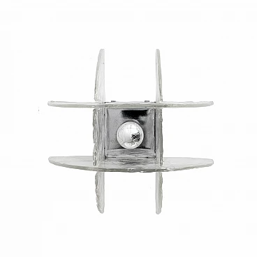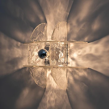 Pair of appliques, wall lamps, made by Carlo Nason, for Mazzega. Italy, 1970s. Made with 4 curved sheets of Murano artistic glass, joined together by interlocking. The base is in chromed metal. Excellent condition despite the age. Possible signs of aging. The appliques have one light each and are equipped with an E27 or E26 socket in the United States.