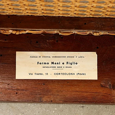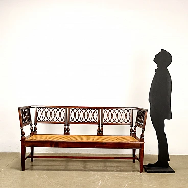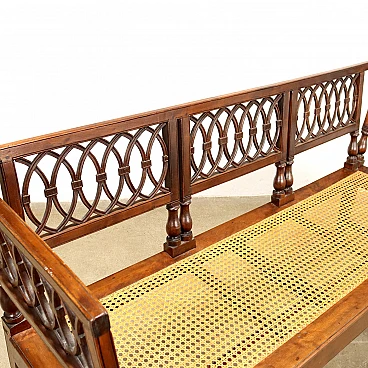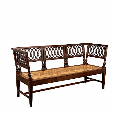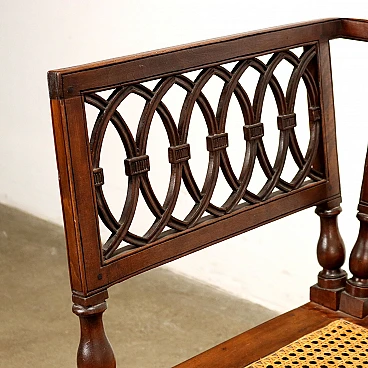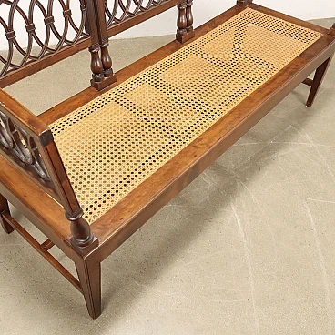 Neoclassical walnut sofa, Lombardy last quarter 18th century. Back and sides composed of open folders decorated with intersecting geometric amygdala motifs, truncated pyramid legs, tanned seat in excellent condition.