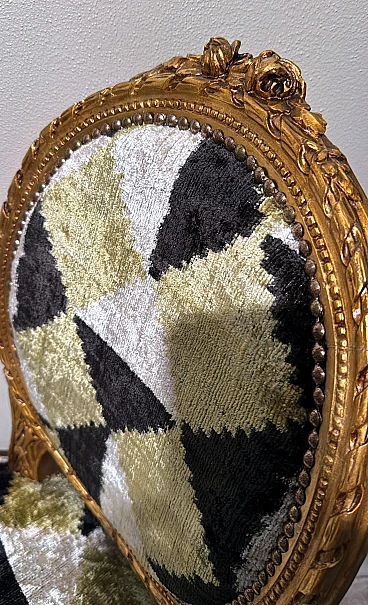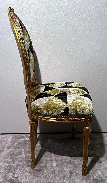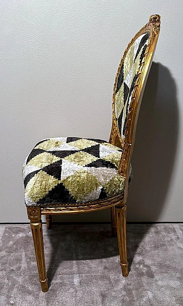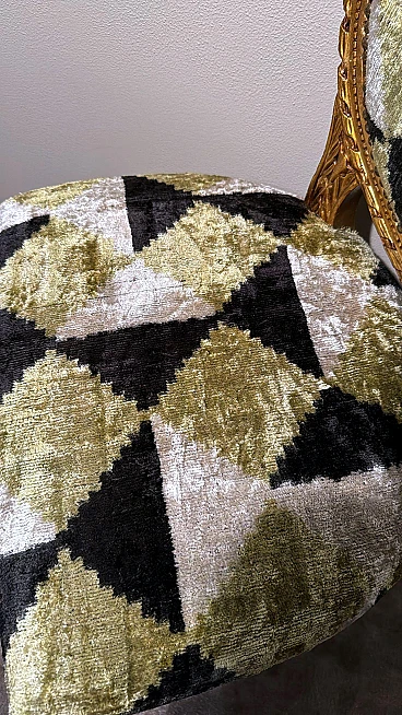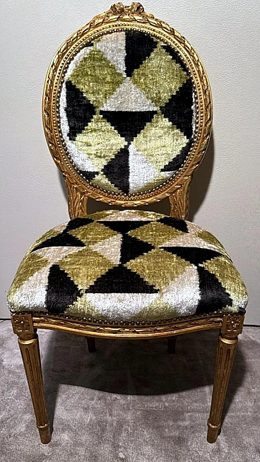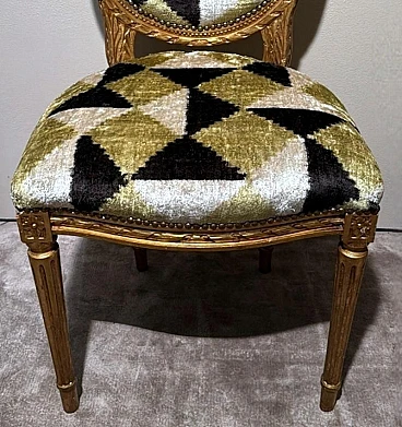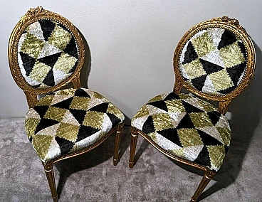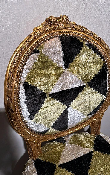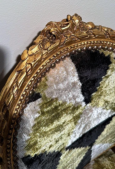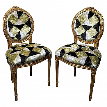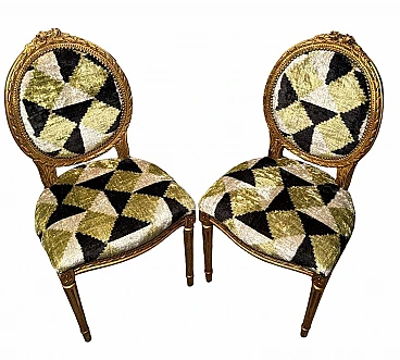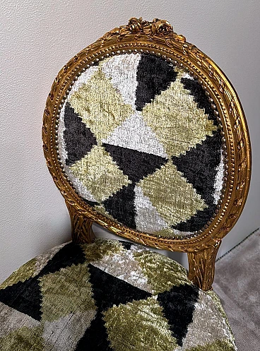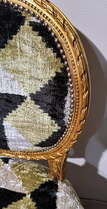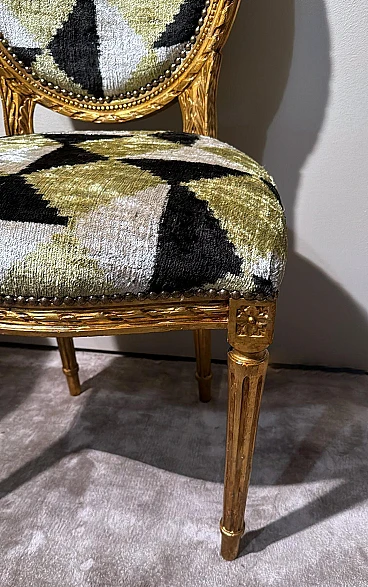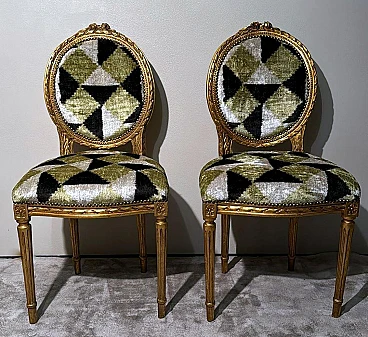 This pair of Louis XVI-style chairs features exquisite craftsmanship: the solid frame of the upholstered seat is supported by four elegant, downward-tapering legs adorned with classic carved fluting. The oval backrest frame is enhanced by the "pastiglia" technique, which replicates a soft ribbon and refined beaded decoration. The hollow of the backrest is filled with soft padding, covered on the back with sturdy velvet, and on the front with an Ikat fabric that envelops the entire chair. Additionally, the chairs have undergone the "gold leaf gilding" technique. These chairs were crafted between 1870 and 1875 in an artisan workshop in Lyon, a significant center of furniture production since the 17th century, renowned for its Renaissance and Rococo-style pieces. Recently, the chairs were entrusted to an experienced master craftsman from Prato, who meticulously handcrafted the new upholstery using a particularly special fabric: a silk velvet Ikat in elegant and refined colors. Ikat is the national fabric of Uzbekistan, where it was produced even before the conquest of those territories by Charlemagne in 329 B.C. The country's trade economy has always flourished due to the rich merchant routes that passed through the legendary "Silk Road." Ikat (which means "cloud" in Uzbek) is a yarn-dyeing technique that creates extraordinary designs with soft, blurred edges. For the gold leaf gilding, "Armenian bole," a red clay powder mixed with glue, was applied to the wooden frame, which had previously been prepared with the "pastiglia" technique. Once dried, very thin sheets of gold leaf were applied. The "pastiglia" technique, rooted in an ancient craft tradition, originated in Italy at the end of the 15th century, remained in use for much of the 17th century, and continued into the 19th century. The " pastiglia" was composed of a paste made from gesso (calcium carbonate), vegetable resins, honey, linseed oil, and often marble dust. A layer of canvas was glued onto the wooden support, followed by several layers of "pastiglia", which were then imprinted, engraved, or finely modeled, usually in bas-relief. After hardening, gilding was applied. In addition to the reupholstery, the two chairs were hand-restored by our team of craftsmen and are in perfect condition. Measurements: width 49 cm, depth 40 cm, height 94 cm, seat height 47 cm.