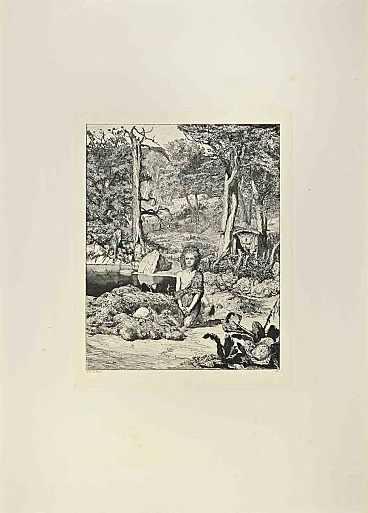 Simplicius at the Hermit's Grave- Simplicius am Grabe des Einsiedlers (plate VIII) belongs to a series of prints called Intermezzi realized by Max Klinger, published by Nurnberg: Stroefer, 1881.Etching on paper.Signed on the plateGood conditions.Dedicated to the engraver and art dealer Hermann Sagert who had supported the publication of the young artist's works. Intermezzi by Max Klinger offers a wide assortment of entertainment, such as short comic interludes between scenes of an opera. The portfolio highlights the capriciousness of life and includes a sequence of four prints on the mythological lives of centaurs, four prints based on Hans Jakob Christoph von Grimmelshausen's 17th-century tale The Adventurous Simplicissimus, and four free compositions that further elaborate Klinger's favorite themes of desire, death and fantasy. The twelve etchings vary in size and format, but all reveal sublime panoramas and demonstrate Klinger's mastery of the vocabulary of romantic landscapes and the lessons learned from studying Japanese prints.