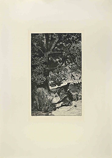 Fallen Rider from Intermezzi belongs to a series of prints called Intermezzi realized by Max Klinger, published by Nurnberg: Stroefer, 1881.Etching on paper.Signed on the plateGood conditions.Dedicated to the engraver and art dealer Hermann Sagert who had supported the publication of the young artist's works. Intermezzi by Max Klinger offers a wide assortment of entertainment, such as short comic interludes between scenes of an opera. The portfolio highlights the capriciousness of life and includes a sequence of four prints on the mythological lives of centaurs, four prints based on Hans Jakob Christoph von Grimmelshausen's 17th-century tale The Adventurous Simplicissimus, and four free compositions that further elaborate Klinger's favorite themes of desire, death and fantasy. The twelve etchings vary in size and format, but all reveal sublime panoramas and demonstrate Klinger's mastery of the vocabulary of romantic landscapes and the lessons learned from studying Japanese prints.