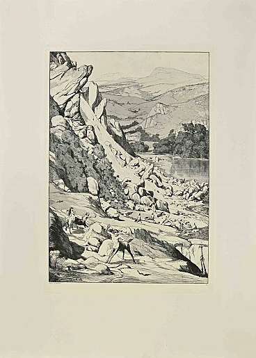 Landslide from Intermezzi belongs to a series of prints called Intermezzi realized by Max Klinger, published by Nurnberg: Stroefer, 1881.Etching on paper.Signed on the plateGood conditions.Dedicated to the engraver and art dealer Hermann Sagert who had supported the publication of the young artist's works. Intermezzi by Max Klinger offers a wide assortment of entertainment, such as short comic interludes between scenes of an opera. The portfolio highlights the capriciousness of life and includes a sequence of four prints on the mythological lives of centaurs, four prints based on Hans Jakob Christoph von Grimmelshausen's 17th-century tale The Adventurous Simplicissimus, and four free compositions that further elaborate Klinger's favorite themes of desire, death and fantasy. The twelve etchings vary in size and format, but all reveal sublime panoramas and demonstrate Klinger's mastery of the vocabulary of romantic landscapes and the lessons learned from studying Japanese prints.