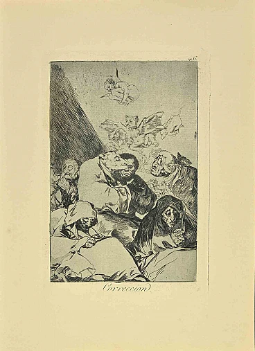 Correccion is a black and White aquatint, drypoint, and etching printed in blue-black ink on laid paper from Caprichos realized after Francisco Goya in 1881-1886.6th Edition. Titled in the lowerVery good impression.Madrid: Calcografia Real, 1881-1886The first edition of Capricci was published on 6 February 1799 and put on sale the same day in a liquor and perfume shop on Calle DesengaÏo, in Madrid. The same day, in the Diario de Madrid, Goya became concerned and tried to reiterate that the Capricci were a work born from his imagination and without real references. However, worried about the public reaction and the inquisition, he decided after only 27 copies were sold to withdraw the edition from the market and so in 1803 he donated the remaining copies of the Caprices and the related plates to the King in exchange for a pension for his son. The work was subsequently reprinted by the Calcografa Nacional of Madrid in several editions from 1855 to 1937 after the first in 1799.