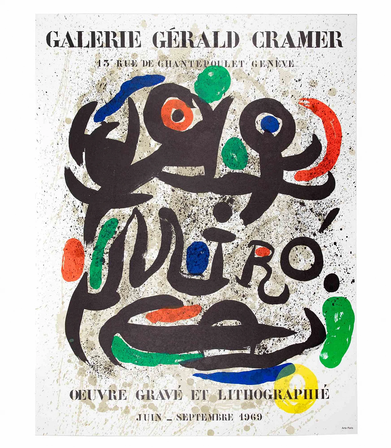 Exhibition Poster Galerie Gerald Cramer is a contemporary artwork realized by Joan Mirò.Mixed colored lithograph.The poster was realized in occasion of the exhibition of the artist held in 1969 in Gerald Cramer Gallery.While Joan Miró (1893-1983) rejected any formal association with movements or groups, including the Surrealists, André Breton recognised him as “the most Surrealist of us all”. His artistic approach encouraged the free play of associations, and envisaged“accidents” to provoke reactions closely connected to subconscious experiences. Miró’s famous motifs consist of freely reshaped fragments cut from catalogues for machinery on canvases to form black silhouettes – solid or in outline, with dramatic accents ofwhite and red.326