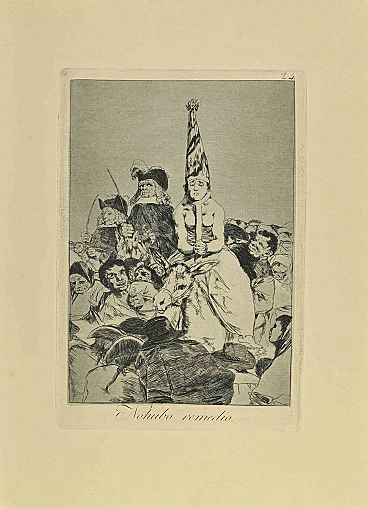 Hubo Remedio is a black and White aquatint, drypoint, and etching printed in blue-black ink on laid paper from Caprichos realized after Francisco Goya in 1881-1886.6th Edition. Titled in the lowerVery good impression.Madrid: Calcografia Real, 1881-1886The first edition of Capricci was published on 6 February 1799 and put on sale the same day in a liquor and perfume shop on Calle DesengaÏo, in Madrid. The same day, in the Diario de Madrid, Goya became concerned and tried to reiterate that the Capricci were a work born from his imagination and without real references. However, worried about the public reaction and the inquisition, he decided after only 27 copies were sold to withdraw the edition from the market and so in 1803 he donated the remaining copies of the Caprices and the related plates to the King in exchange for a pension for his son. The work was subsequently reprinted by the Calcografa Nacional of Madrid in several editions from 1855 to 1937 after the first in 1799.