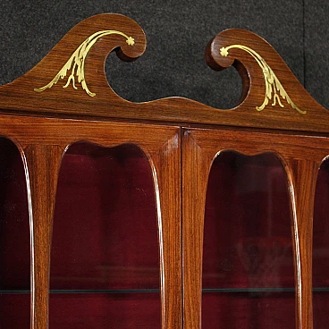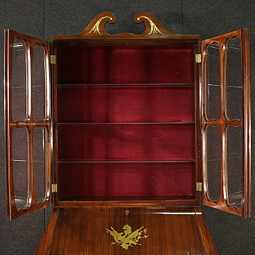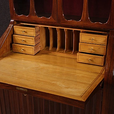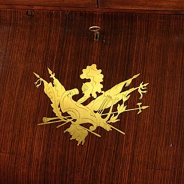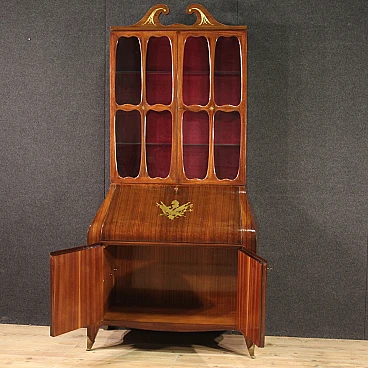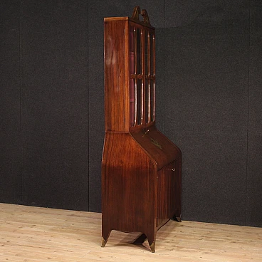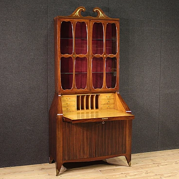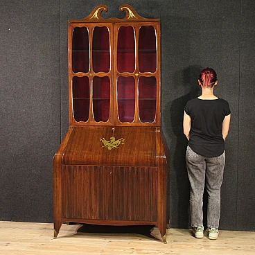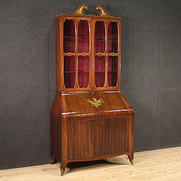 Italian Trumeau of the 1950s/60s. Double body furniture built on a design by Paolo Buffa, in rosewood with golden and chiseled brass inlays. Body greater than two doors complete with glass shelves and working key. Lower body equipped with two doors and drops. Internation of the limited wooden limelight with 6 drawers, 5 compartments of documents and desk plan for good size and service. Belief of less than two doors that offers a large lack of shelf compartment inside (see photo). Mobile that has undergone some small conservative restoration, structurally healthy and complete with keys. In good condition.