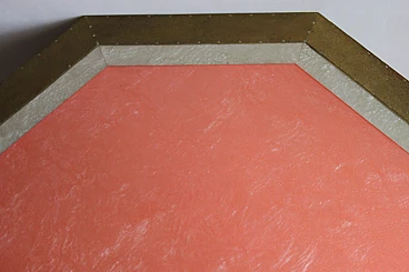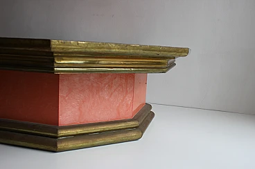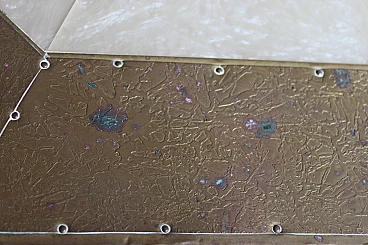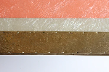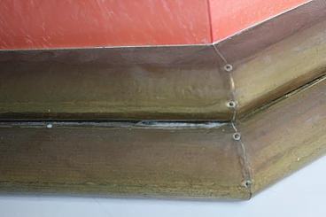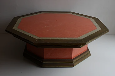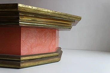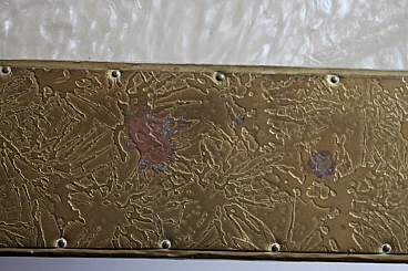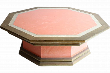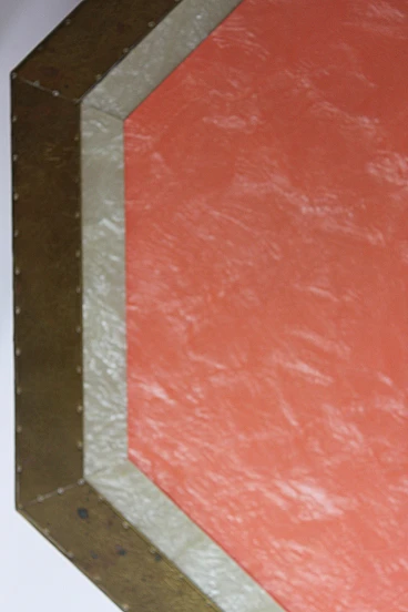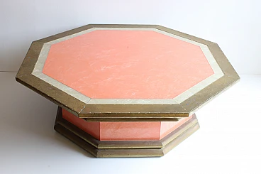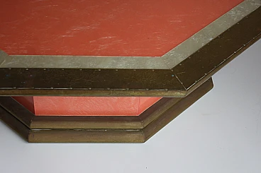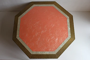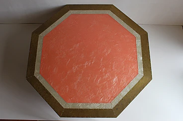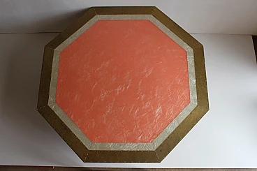 A hollywood regency brass and faux-pearl coffee table designed and crafted by argentinian designer rodolfo dubarry. He set up a workshop in marbella, spain in 1968 and manufactured made-to-order furniture for the jetset of marbella. Every piece was uniques. This piece was designed and created for an exhibition in the Cavalieri Hilton Hotel in Rome. Table is signed by Rodolfo Dubarry on the top. Condition report: Good vintage condition, some signs of wear like the copper is oxidized in some spots, shown in the pictures.