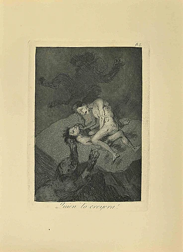 Quien lo creyera! is a black and White aquatint, drypoint, and etching printed in blue-black ink on laid paper from Caprichos realized after Francisco Goya in 1881-1886.6th Edition. Titled on the lowerVery good impression.Madrid: Calcografia Real, 1881-1886The first edition of Capricci was published on 6 February 1799 and put on sale the same day in a liquor and perfume shop on Calle DesengaÏo, in Madrid. The same day, in the Diario de Madrid, Goya became concerned and tried to reiterate that the Capricci were a work born from his imagination and without real references. However, worried about the public reaction and the inquisition, he decided after only 27 copies were sold to withdraw the edition from the market and so in 1803 he donated the remaining copies of the Caprices and the related plates to the King in exchange for a pension for his son. The work was subsequently reprinted by the Calcografa Nacional of Madrid in several editions from 1855 to 1937 after the first in 1799.