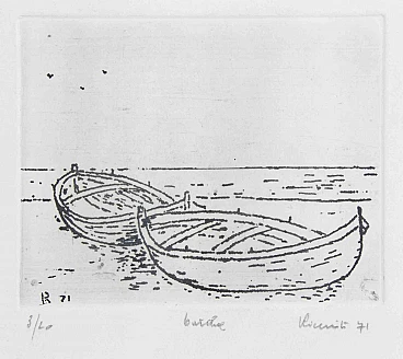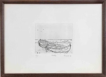 Boats is a modern artwork realized by Michele Ricciuti in 1971.Black and white etchingHand signed, numberec and dated on the lower margin.Edition of 3/20Includes frame