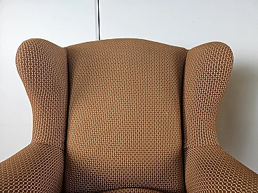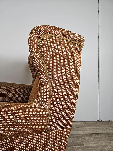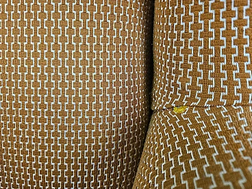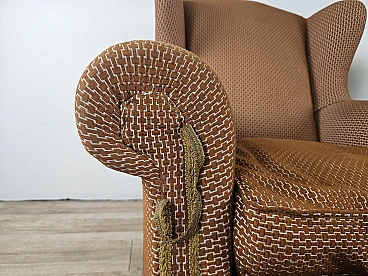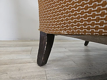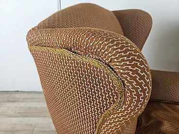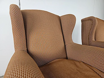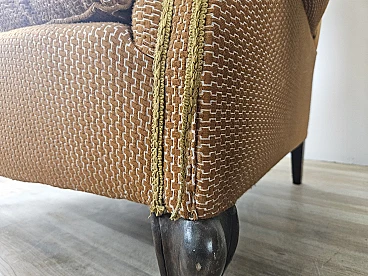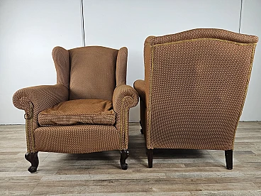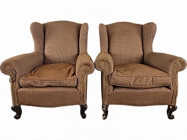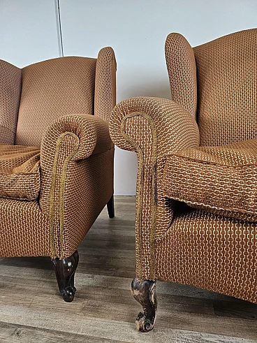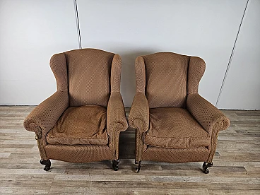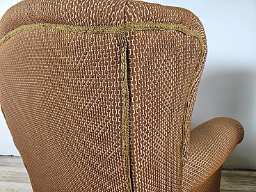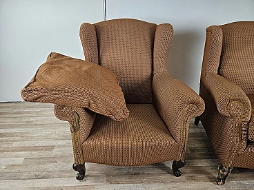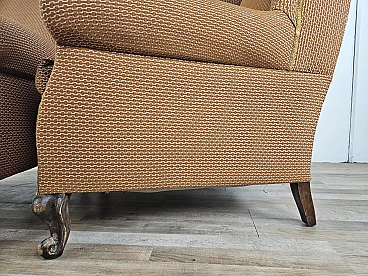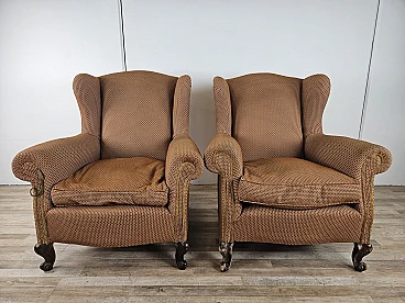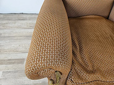 Pair of large lounge or hall armchairs from the 1950s, upholstered in fabric with padded cushion and wooden feet. The armchairs need restoration and new upholstery as shown in the photo.
