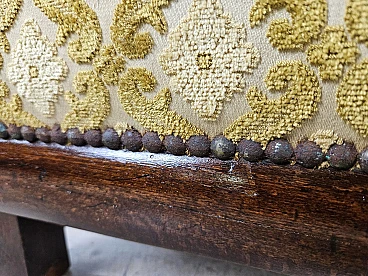 Elegant pair of walnut poufs from the early 1930s from the Art Deco era, upholstered and reupholstered around 1990. Very particular, decorated with brass studs along the perimeter and with a modern and functional design. The poufs have been polished with oil and shellac, they show normal signs of wear due to age and use. Some studs on the profile have rust as shown in the photo.